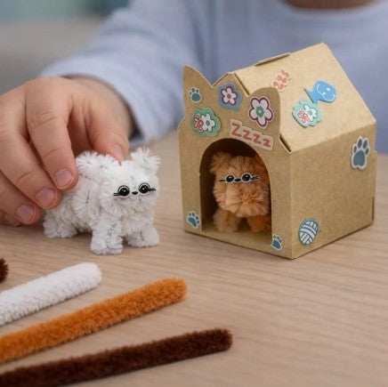 Kit includes: 12 fluffy pipe cleaners, card cat house, card cat bowl, card cat food , card cat bed, sticker sheet