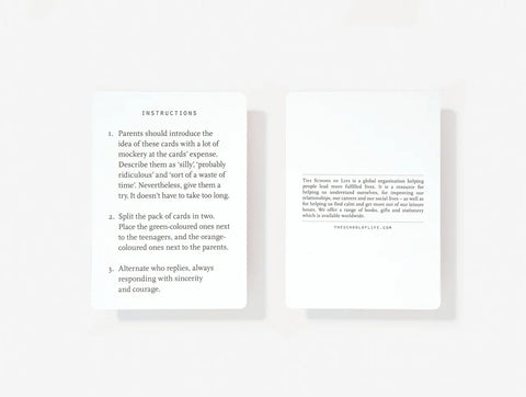 Not many teenagers want to talk to their parents that much. Their reasons are numerous and often sensible; yet for parents, the silence can feel painful and mysterious. What happened to their once chatty little ones? What might teenagers truly want to tell their parents, if only there was the right opportunity? And what might parents want to tell their children in turn, if it didn’t generate an immediate wince or boredom? This is a pack of cards that can break a log-jam of frustration and silence between generations with humour and curiosity.