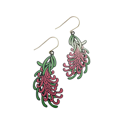 Delicate, detailed, and distinctly Australian, our Grevillea Flower Earrings in Black, Green & Pink celebrate one of our most beloved native blooms. Featuring a hand-drawn curved branch of Grevillea flowers and leaves, this design combines lush green foliage with dark pink blossoms and fine black detailing.