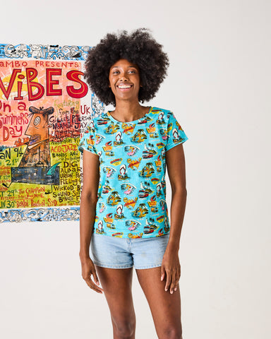 Step into a sun-drenched, retro dream with the Kip&Co x Mambo Mambo World Adult Organic Cotton T-shirt! Packed with bold Australiana summer scenes in sunset shades of yellow, orange, and pink on a sea-blue base, this tee is pure holiday mode, no passport required. Made from 100% organic cotton for all-day comfort, it's perfect for beach hangs, backyard BBQs, and chasing good times. Classic Mambo mischief meets Kip&Co colour - wear it loud, wear it proud, and let the good vibes roll!