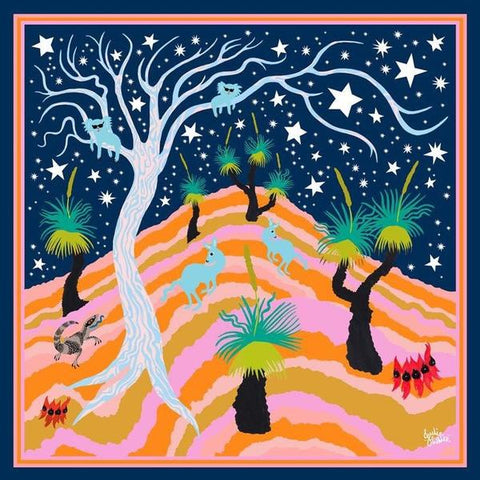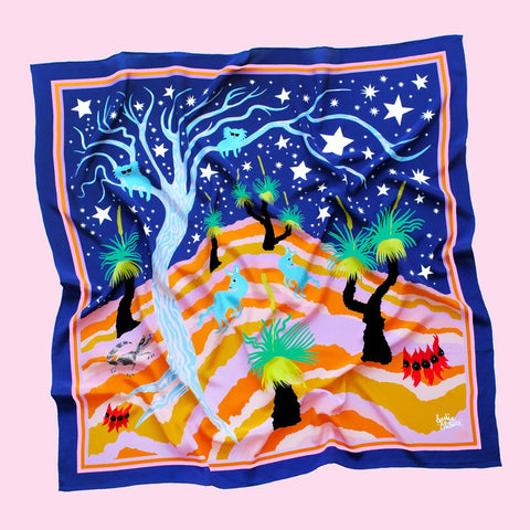 This scarf comes from the the work 'Into the Mystic' featuring a hand painted print inspired by the weird and wonderful of the Australian outback after dark, memories of camping in the bush and feeling like you're in the middle of nowhere staring up at the starry night sky and letting your imagination take over!