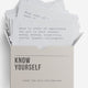 These Know Yourself Prompt Cards are designed to assist us in a journey of self-knowledge. They present us with a range of ideas and questions that encourage self-reflection, allowing us to become a little more aware of what we really need and what our priorities and potential might be. Each card carries an exercise on one side and a piece of analysis on the reverse to help you gain insight and clarity on that ever elusive subject: yourself.