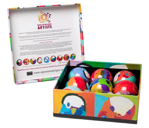 Xmas Bauble bunting features artwork reproduced under license from Warlukurlangu Artists by Karen Napaljarri Barnes. Established in 1985 Warlukurlangu Artists Aboriginal Corporation is a not-for-profit organisation that is 100% Aboriginal-owned by its artists from the remote desert communities of Yuendumu and Nyirripi in Central Australia.