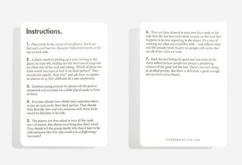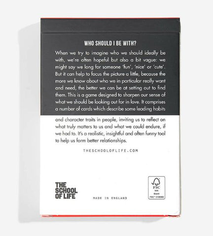 Who Should I Be With? is a game designed to sharpen our sense of what we should be looking for in love. It comprises a number of cards which describe some leading habits and character traits in people. Each card has a character trait on one side and the opposite trait on the reverse; listing the pros and cons of each to help guide you to more successful choices in love. It’s a realistic, insightful and often funny tool to help us form better relationships.