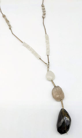 A stunning opera length neckpiece featuring a blend of moonstone and a dramatic faceted smoky quartz pendant.