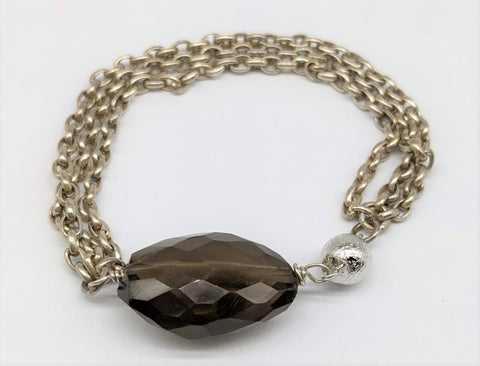 A beautiful bracelet featuring three sterling silver chains with a statement faceted smoky quartz bead.